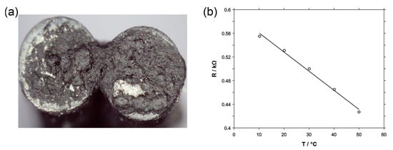 In the first instance, an optimization study of the volume used to perform the drop-casting procedure was carried out (data not shown). For this purpose, optical microscopy was employed to assess the SNGC-modified surface after each deposition. The selected volume was 0.8 µL, drop-casted twice. This decision follows the reasoning line of maximizing the coverage and also keeping the layer homogenous. An inspection of the resulting surface can be seen in Figure 3a. In order to ensure the suitable behaviour of the sensor, the deposited layer must cover the junction space between the capillary glasses. The MWCNT paste must be in contact with both SNGC electrodes simultaneously to close the electrical circuit properly. The analytical performance of the temperature probe was assessed by recording the resistivity via a multimeter at different temperatures (10–50 °C). The chosen temperature range was selected based on the future application of the probe in biomedical samples. The results of the calibration curve are shown in Figure 3b. As expected, an adequate linearity (R2 > 0.999) was obtained. Regarding the sensitivity of the sensor, a value of −0.002 kΩ/°C was calculated. This value is similar to that of other similar CNT-based temperature probes found in the literature []. The negative slope indicates that the obtained sensor can be categorized as a negative temperature coefficient resistance (NTCR) device. To evaluate the repeatability and reproducibility, a similar procedure as in the case of SNGC-PANI was performed. The relative standard deviation results are 2.16% and 2.80%, respectively, taking the slope as the studied factor. Therefore, as in the previous scenario, the obtained analytical performance of the temperature probe is considered as suitable.