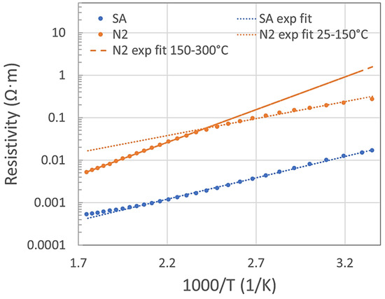 The thermal analysis in a range of 25–300 °C was measured in SA and N2, as shown in Figure 1. In a standard semiconductor, the free charge carriers are thermally activated, meaning the resistivity should follow (if other effects are negligible) the Equation (1):