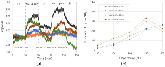 Sensor response to 11 ppm NO2 at diverse temperatures: (a) sensor response with 30 min NO2 exposure and 30 min SA purge; (b) sensor response after 5, 10, 20 and 30 min of NO2 exposure.