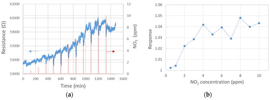 Sensor response at 250 °C to diverse NO2 concentrations: (a) 10 min NO2 exposure followed by 110 min pure SA purge; (b) response to NO2 after 10 min exposure.