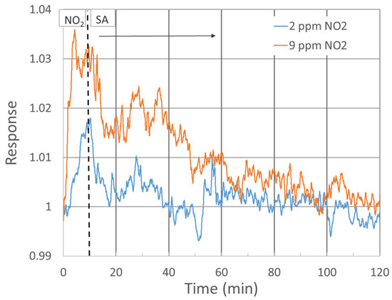Sensor response during recovery in pure SA over 110 min after 10 min exposure to 2 and 9 ppm NO2 gas.