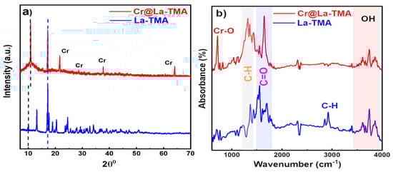 (a) XRD patterns of La-TMA and Cr@La-TMA, (b) FTIR spectra of La-TMA and Cr@La-TMA.