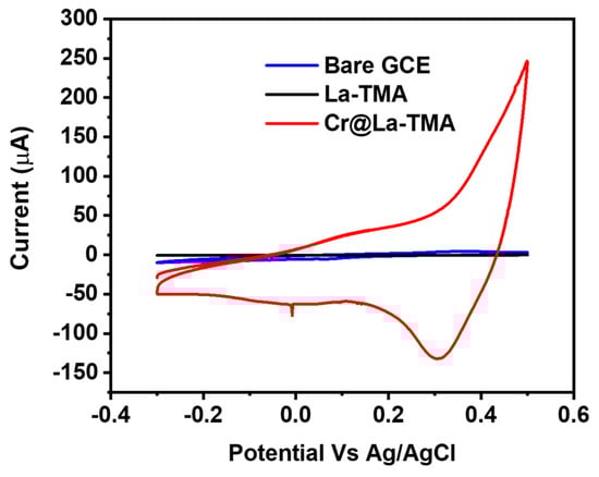 Cyclic voltammograms of Bare GCE, La-TMA, and Cr@La-TMA.