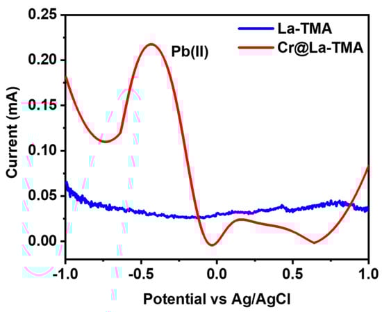 The glassy carbon electrode (GCE) was pre-treated via polishing with 0.3 and 0.05-micron alumina slurry, sonicated in deionized water and ethanol for 2 min, and then dried at room temperature. Later, 10 μL of each material (i.e., La-TMA, Cr@LA-TMA) was drop cast over GCE and utilized for electrochemical sensing. For the selectivity measurement, we have added a 5 nM concentration of each heavy metal ion (Cd(II), Hg(II), Cu(II), Cr(II), Fe(II) and Pb(II)) into the acetate buffer electrolyte. We have set potential window, keeping in mind that the redox potentials of all aforementioned heavy metal ions lie in the wide potential window, i.e., −1 V to 1 V. The DPV response analysis of La-TMA- and Cr@La-TMA-modified electrodes (Figure 3) provided evidence of the selective behavior of the Cr@La-TMA-modified electrode towards Pb(II) ions. The absence of a notable response for other HMIs further underscored the potential of the Cr@La-TMA-modified electrode as a selective electrochemical sensor for Pb(II) detection.