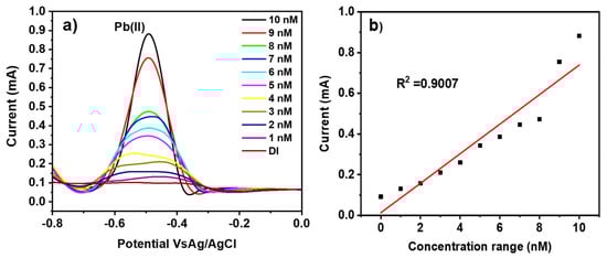 The DPV response obtained from Cr@La-TMA for different concentrations of Pb(II) ions is shown in Figure 4a. The plot showcased the electrochemical response of Cr@La-TMA when exposed to varying concentrations of Pb(II) ions, spanning from 1 nM to 10 nM. The DPV response curve exhibited a distinct and proportional increase in peak current as the Pb(II) concentration increased.