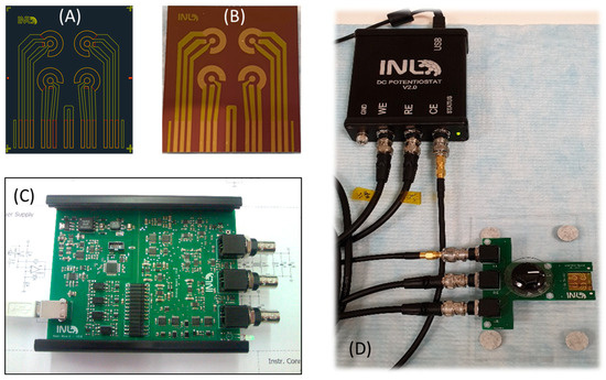 Electrochemical cell chip design (A) and fabrication (B) using microfabrication techniques; custom-made electrochemical portable platform (C) and complete set-up (D).