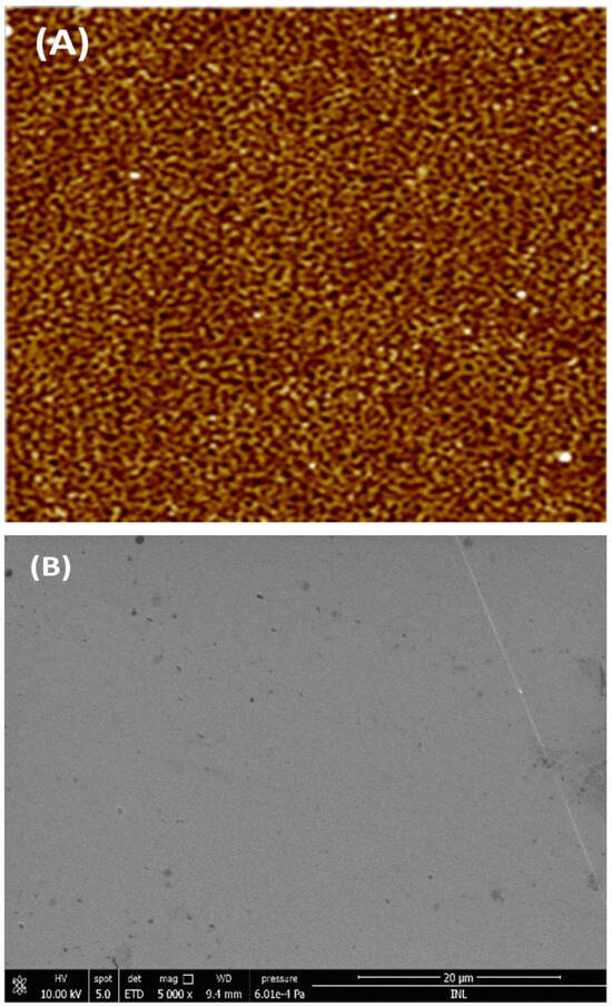 AFM image (A) with the roughness Ra of 0.92 ± 0.02 for the bare electrode and corresponding SEM image (B) of the WE surface, scale bar 20 μm. The roughness average (Ra, nm) is expressed as the average ± standard deviation (n = 3).