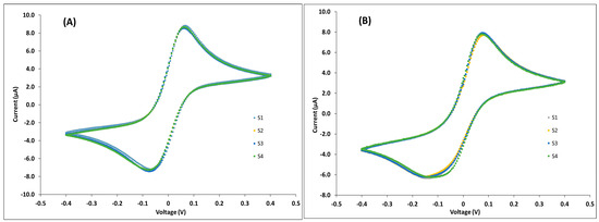 Cyclic voltammograms of the different sensors of an ECC acquired in AUTOLAB (A) and in the developed EPP (B) in 5 mM [Fe(CN)6]3−/4− (PBS 10 mM, pH 7.4) at 50 mV.s−1 using 5 mV voltage step.