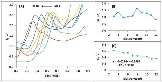 APAP voltametric behavior was first assessed at pH 7 based on the optimum pH identified in several works [11,12,13], where a well-resolved oxidation peak appeared at around +0.45 V (vs. PRGE). However, accordingly to the literature, the optimum pH can vary greatly from acidic [14] to basic pH [15]. Our own pH investigations (Figure 4) indicated a maximum oxidation peak at pH 8 (Figure 4B). Moreover, APAP’s oxidation peak shifts towards less positive potentials, presenting a slope of −30 mV/pH (Figure 4C). An electrolyte at pH 8 was selected as the optimum and used in further studies.