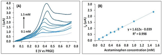 Under the optimum conditions obtained above, the ECCs were then applied to detection of APAP at increasing concentrations from 0.1 to 2 mM (Figure 6). The linear range of this sensor varied from 0.1 to 1.5 mM, and the sensitivity retrieved from the calibration curve (Figure 6B) corresponds to 1.6 μA.mM−1 (203.8 μA.mM−1.cm−2, based on the geometrical area of the working electrode of the sensor). The limit of detection (LOD) was calculated based on the standard deviation of the response and the slope of the calibration curve (LOD = 3.3σresidual-CC/slope) [16], which was 67 μM. This value is higher compared with other literature works that employed miniaturized systems with three integrated electrodes for detection of APAP, such as those based on screen-printing [17,18,19] or paper-based technology [20,21]. Possible explanations for lower analytical performance of the EPP could be related to a very low geometrical area (0.0079 cm2) of the WE in the ECCs and the use of a less sensitive technique, as in the case of CV. Accordingly to the work of Fanjul-Bolado et al. [22], a comparison of electrochemical techniques used for APAP detection demonstrated a 5 times higher sensitivity for square wave voltammetry compared to CV. However, this technique was not available in the developed EPP.