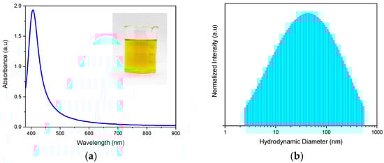 HA-AgNPs were successfully synthesized by a wet chemical reduction of AgNO3 as an Ag precursor using NaBH4 as a reducing agent, as evidenced by the characteristic golden-yellow color of AgNPs shown in the inset photo in Figure 1a. Based on the obtained optical absorbance spectra of freshly-prepared HA-AgNPs, the maximum peak of the HA-AgNPs was seen at 404.5 nm, which is similar to that of AgNPs, and this was consistent with the value previously reported in the literature [25]. Further analysis of the absorbance spectra revealed that the HA-AgNPs had an FWHM of 45.12 nm, indicating their monodispersity in the colloidal mixture. This was further evidenced by the hydrodynamic diameter distribution of HA-AgNPs, as shown in Figure 1b. The HA-AgNPs were found to have an average hydrodynamic diameter of 42.9 nm, with a polydispersity index of 0.438.