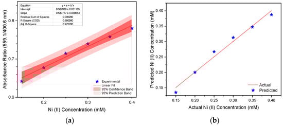 (a) Calibration curve showing the linear dependence of absorbance ratio at 559.1/404.5 nm with the Ni (II) concentration and (b) the comparison of the predicted Ni (II) concentration based on the generated calibration curve and the actual concentration of as-prepared Ni (II) solutions.