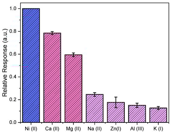 Relative response of various metal ions against Ni (II) ions in aqueous solution showing the selectivity of the synthesized HA-AgNPs assay as a colorimetric nanosensor for Ni (II) detection against other common ions in water.