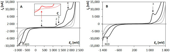 Cyclic voltammograms recorded on BDDE in the absence (dotted line) and presence (solid line) of 5 × 10−5 mol/L OH-CBL in acidic (A) and alkaline (B) supporting electrolytes. (C) Detail of the area of signal 1 in an acidic medium. Parameters: supporting electrolyte: 0.1 mol/L H2SO4 (A,C) and BRB (pH 10) (B), Ein = Efin = −1000 mV (A,C) and −1500 mV (B), Eswicth = +2200 mV (A) and +1800 mV (B), v = 100 mV/s (A–C).