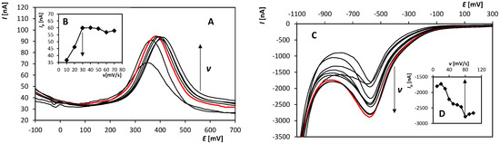 Anodic (A) and cathodic (C), respectively, DP voltammograms recorded on BDDE in the presence of OH-CBL at various scan rates. (B,D) Dependence of the peak height (peak 1 (B) and RED (D), respectively) on the scan rate. Parameters: supporting electrolyte: 0.1 mol/L H2SO4 (A–D), pretreatment (20 “potential jumps” between +2000 mV and −1500 mV) (C,D), Ein = −400 mV (A,B) and +2000 mV (C,D), Efin = +2300 mV (A,B) and −1500 mV (C,D), v = 10–70 mV/s (A,B) and 10–100 mV/s (C,D), pulse height of 50 mV (A,B) and −65 mV (C,D), pulse width of 80 ms (A,B) and 20 ms (C,D).