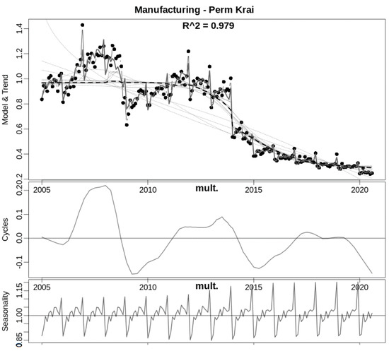 The example demonstrates a median-declining S-shaped trend, and the “cloud” of all the trends, depicting possible distributions of fits for estimates at each point. The cycles clearly show a decline in 2008–2009 (global crisis), 2014–2015 (economic sanctions against Russia) and 2020 (pandemic). Seasonality achieves its peak in December, and shows slow growth through the given period. This is one “typical” example of the dynamics, but for other regions and industries it varies drastically.