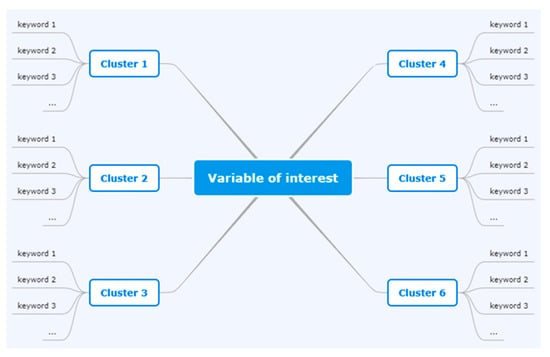 In real Big Data applications, it is not easy to find a single algorithm that meets the properties described above. The diagram (Figure 1) represents the sequence from a universe of words related to a variable of interest to predict. The graph shows how the keywords initially relate to each cluster and the predicted variable.