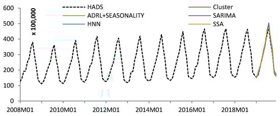 The prediction of the final HSCA model is compared to other models cited in the Introduction section. The comparative graph of the forecasting time series can be seen in Figure 3.