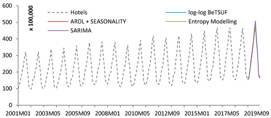 This subsection cites and reviews the relevant literature and the most-used models in hotel accommodation forecasting from the last 50 years. There are great reviews of the literature that highlight the predictive capacity of the models in Time Series, Econometric Modeling, Neural Networks or other relevant frameworks in the tourism field [11,12,13,14]. In the big data field, there are also several reviews applied to tourism forecasting [15,16,17]. As we referred to before, three forecasting models are extracted from the review that we will use as a comparison for our contribution to the literature: Entropy Model, Seasonal Autoregressive Integrated Moving Average (SARIMA), and Auto-regressive Distributed Lags extended to Seasonality (ARDL + Seasonality).