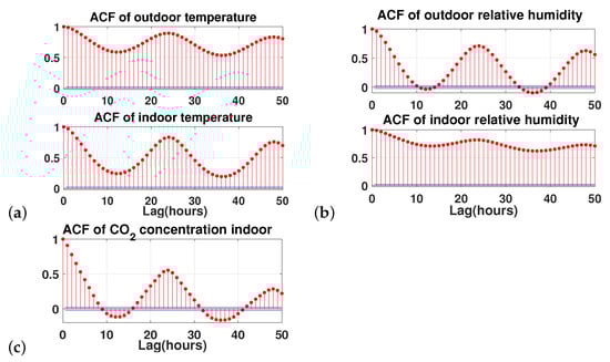 Autocorrelation values of environmental variables: (a) temperature, (b) relative humidity, and (c) Carbon dioxide concentration.