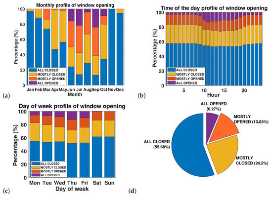 Distribution profile of window opening according to the (a) Month, (b) Hour of the day and (c) Day of the week. (d) Statistics for window opening categories.