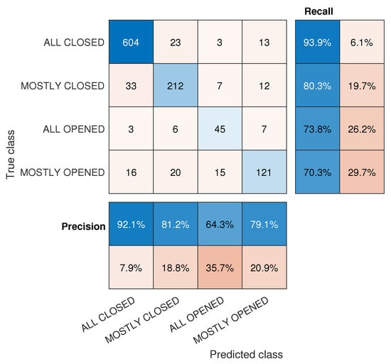 The output of the Classification Learner App shows that a fine k-NN model has been obtained with an accuracy of 92.2%. Using this trained k-NN classifier, we predicted the testing set and compared it to the monitored value, obtaining a value of 86.1% for accuracy. A confusion matrix for this test set is displayed in Figure 3. The highest recall value (true positive rate) is obtained when predicting the ‘ALL CLOSED’ state of the group of windows (93.9%) while the lowest belongs to the ‘MOSTLY OPENED’ label (only 70.3%). Regarding precision values (positive predictive values), the highest value is still obtained by the ‘ALL CLOSED’ state; however, the lowest value corresponds to the ‘ALL CLOSED’ label.
