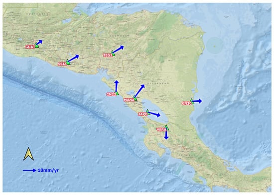 With regard to geodetic control, the variations of the absolute coordinates obtained through a geodetic calculation and adjustment process are analyzed in both Cartesian coordinates (X, Y, Z) and topocentric (east, north, up) using different techniques that guarantee millimeter-level precision to provide optimal results for regional tectonic or volcanic surface deformation parameters [10] of the region. This implies the use of precise auxiliary parameters such as precise ephemeris, corrections of the satellite clocks and the tropospheric models, as well as data processing and filtering methods capable of jointly managing the results. Figure 1 shows the absolute geodynamic model obtained from the analysis of the stations time series: GUAT, SSIA, TEG2, MANA, JAPO, CN22, CN30 and VERA. The Table 1 contains coordinates and velocities of the GNSS stations analyzed.