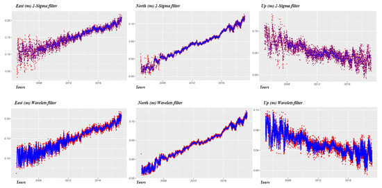 Figure 2. MANA time series solutions, with 2-sigma and wavelets filtering applied.