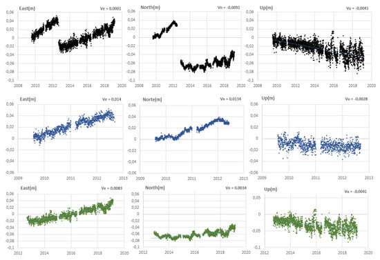 Figure 4. VERA time series in three different phases. This figure shows the changes in series trend (absolute series “black”, pre-seismic series “blue” and post-seismic series “green”) GNSS data analyzed: 2008–2019.