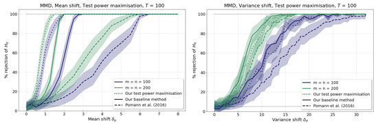Next, we apply the method described in Section 3.4 to maximise the test power. Specifically, we search for the Gaussian kernel bandwidth (over spaces defined in Table A1 in Appendix A.2), that maximises the argument of in our approximations of (7) on our training samples. For demonstrative purposes, we choose to split our dataset equally into training and testing sets although other ratios may lead to higher test power. Figure 2 shows the results of the optimised test (dotted lines) against the baseline results (solid lines) and the results of [15] (dashed lines) for and samples and discrete points in time. We find that the test power is significantly improved by our optimisation for the detection of mean shifts. For instance, test power rises fourfold for and compared to our baseline method. Furthermore, we have no type-II errors once for , as compared to for our baseline test and for [15]. In its current form, however, our optimisation does not yield higher test power for the detection of variance shifts, a fact that we discuss in Section 6.