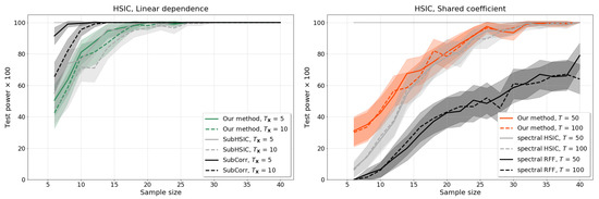 Figure 3 (right) displays the power of our independence test for the case of dependent samples through a shared coefficient for varying sample sizes m and measurements T. We compare our results to two spectral methods [18] that approximate the distribution under using eigenvalues of the centred kernel matrices of and : spectral hsic uses the unbiased estimator (4) as the test statistic with the eigenvalue-based null distribution; and spectral rff uses a test statistic induced by a number of random Fourier feature (rffs) (set here to 10) that approximate the kernel matrices of and . Our method and spectral hsic achieve improvement in test power compared to spectral rff. For small numbers of samples (), our method outperforms spectral hsic, which converges to the performance of our method with increasing sample size, as we would expect it [22] (Theorem 1).