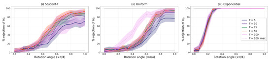Results of the hsic-based independence test: Percentage of rejected in rotation dependence experiments for different number of discrete time points T and coefficients and drawn from three distributions: (i) student-t, (ii) uniform, and (iii) exponential (see Appendix A.3). The sample size is . The violet dotted lines are the results of our test power maximisation.