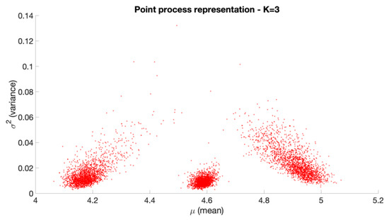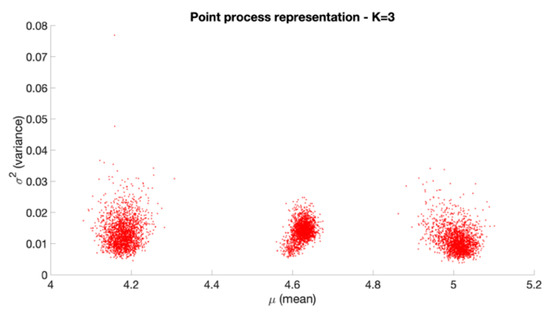 To produce sampling representations of the posterior draws, (M, the number of draws) is plotted against . This scatter plot is closely related to the point process representation of the underlying mixture distribution. A finite mixture distribution from a fixed parametric family has a representation as a marked point process [12]. Here, we use point process representation (Figure 1) of draws from the posterior density. Three clusters of draws are distinguished, they will scatter around the three points corresponding to the true point process representation, with the spread of the clouds representing the uncertainty of estimating the points (Figure 1).