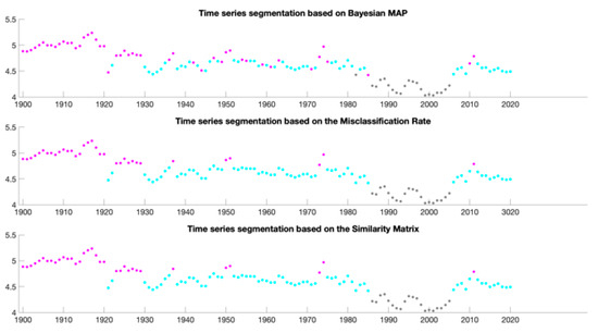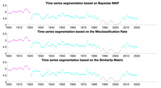 We confirm the existence of the three regimes previously found (1900–1921; 1922–1985 and 1986–2020; 1986–2005). This time, all the years have a perfect cluster membership. The periods of the regimes are well defined (Figure 5).
