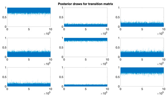 The transition probabilities , , are high (Figure 3, Table 4), which indicate that is difficult to change from on regime to the other.