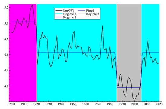 To investigate the hypothesis that the time series follows different periods over 1900–2020, we first used a finite mixture of distributions with normal components, as a way of putting similar data points (years) together into clusters (which we call regimes). Clusters are represented by the components’ distributions of the mixture. The idea is that the years that exhibit the same behaviour belong to the same cluster and come from the same distribution.