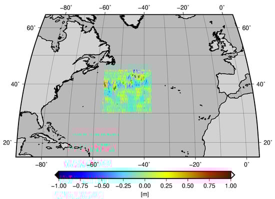 The following empirical covariance function of a two-dimensional geodetic application shall serve as a small example to demonstrate the necessity of different covariance functions presented in this work. Here, we interpret a time series of sea level anomalies (SLA) along the altimeter track as a stationary stochastic field in planar approximation, i.e., two-dimensional domain. To obtain SLA, sea surface heights observed by the Envisat satellite launched and operated from 2002 until 2012 by the European Space Agency were reduced by a long-term mean sea surface model (in this case, CNES-CLS11, [33]) interpolated along the satellites ground track. For the demonstration example, we extracted a subset of 10,905 observations in a local area of the North Atlantic ocean of cycle 13 (13 January 2003 to 17 February 2003); see Figure 2. We computed empirical estimates of the isotropic covariance function averaged for equidistant lags () and by using the biased estimator (see the black dots in Figure 3).
