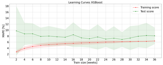 Figure 3 shows LCs obtained with the XGBoost algorithm. When the training-set size is small, the training error is lower since the information variance to be learnt is tiny. As a consequence, the model has no generalization capability and its test error is high. When the training set size increases, training MAPE increases and test MAPE decreases. Adding training data helps to reduce bias error. Training and test curves are very close between 20–28 training weeks. This narrow gap shows a low variance error: Training data are fitted well and the algorithm can generalize on unseen data. The gap increases for a training size higher than 28 weeks, which may indicate an overfitting problem. In this case, a training size of 24 weeks seems to be a good compromise for XGBoost.
