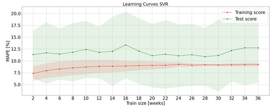 LCs for the SVR algorithm are shown in Figure 4. Bias error slightly but progressively decreases with a training set size; variance error reaches its minimum between 20 and 28 weeks. Hence, an appropriate training set size is 24 weeks.