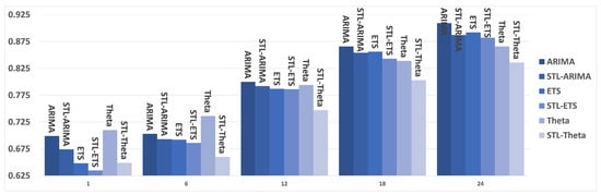 This result becomes obvious in Figure 1, showing OWA ≤ 0.910 performance results for the three advanced statistical methods (ARIMA, ETS, and Theta), by comparison with Figure 2, showing OWA ≥ 0.914 performance results for the five machine learning methods. Above all, Figure 1 and Figure 2 show the impact of STL decomposition as a preprocessing step of statistical and ML methods on the forecasting performance results.
