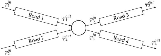 where L is a diagonal matrix containing the road lengths. Furthermore, the inflows and outflows of adjacent roads are dependent on each other through intersections as shown in Figure 1. Intersections are modeled as 0-dimensional points that do not store vehicles. To model the exchange of inflows and outflows of the different roads at the intersections, we use the parameters called turning ratios. Let be the set of incoming roads to some intersection and be the set of outgoing roads from n. A turning ratio for and defines the proportion of vehicles exiting i that enters j.