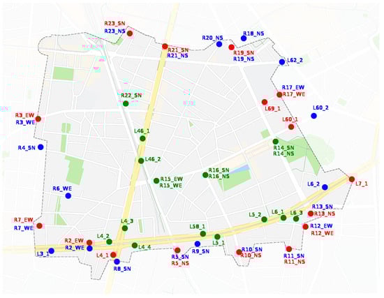 Stationary flow sensors located in downtown Grenoble. The text refers to sensor identifiers. Sensors in blue, correspond to boundary inflows; in red to boundary outflows; and in green to validation flows.