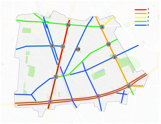 The Functional Road Classification (FRC) is used to classify roads into homogeneous classes depending on their role in a transportation network [17]. This classification determines the type of use of each road, for instance, as it differentiates between major roads that experience heavy traffic from a variety of O/D pairs, and minor roads which are inside of a residential area and experience light traffic only. Figure 3 shows the FRC of each road of the considered zone of Grenoble, and Table 1 shows each class description (Source: https://developer.tomtom.com/traffic-stats/support/faq/what-are-functional-road-classes-frc, accessed on 29 June 2021). Roads that are not colored in the figure have class 7.