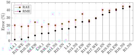 Figure 5 shows the obtained error metrics for all the available validation sensors. The RME shows that the proposed estimator provides close estimates to the real values, as half of the validation locations present an error under 20%, and all cases presented an error under 50%. When considering the RAE, the error increases as this metric considers not only the differences between the mean trajectories, but also takes into account the dispersion of the real data. Nevertheless, for half of the locations, the RAE lies between 20% and 30% showing a good agreement of the estimation with the real data. Similarly to the RME, all locations have a RAE under 50%.