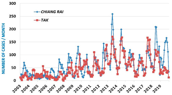Time series of the number of cases of scrub typhus per month from January 2003 to December 2019 in Chiang Rai and Tak provinces.