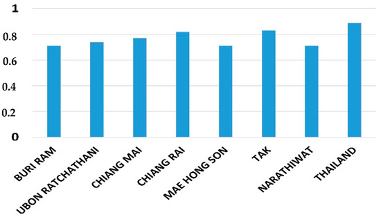 Hurst exponent H is a measure of the long-term memory of the stochastic process underlying a time series. A value of H = 0.5 indicates the lack of memory in the data (Wiener process, white noise). The closer the value of H to 1, the higher the persistence of long-term addiction (positive correlation). The data sample exhibits a persistent behavior when 0.5 < H ≤ 1. In such case, if the series increases (decreases) in the previous period, then there is a significant probability that it will maintain this tendency for some time in the immediate future. By contrast, the range 0 ≤ H < 0.5 corresponds to an anti-persistent series (negative correlation), a behaviour all the more marked as H approaches zero. There are several methods for estimating the Hurst exponent of time series with different sizes [21,22,23]. Figure 2 provides the highest Hurst exponents found at the province level in Thailand.