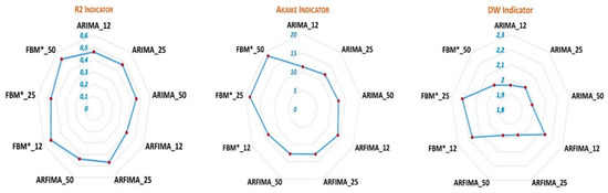 National level: each of the three models is applied with the three learning windows to the data aggregated at the Thailand level. To compare the performance of the models and their configuration of use, the values of R2 of the prediction horizons of 1, 2 and 3 months are averaged to give a “R2 indicator”. This procedure makes it possible consider the best score—obtained for h_p = 1 month—but also the decrease in this score over the period of interest for health prevention. The same procedure is used to produce an Akaike indicator and a Durbin–Watson indicator. The results are collated in Figure 3 for comparison.