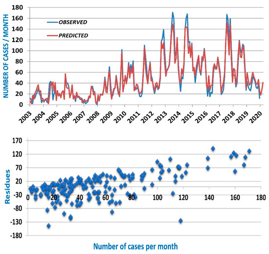 (Top) Observed and predicted time series of scrub typhus cases for Tak province with ARFIMA_25 model and hp = 3 months; (Bottom) scatter plot of the residues (observed minus predicted data).