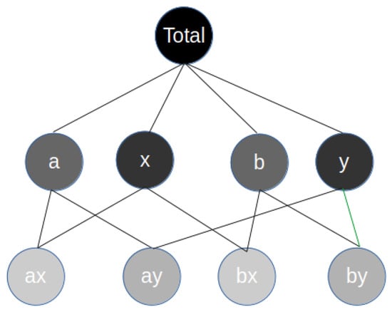 We work with a collection of s-related univariate time-series , where and denote the value of time-series i at time t. The time-series are aggregated by groups; in fact, each time-series is associated with an element l of every group g present in the dataset. We use vector of size s to encode this information. It has value 1, when the series s belongs to the element l of the group g, and 0, otherwise. To give a simple example, consider a dataset with two groups (g1 and g2), each one with two different elements (a and b, and x and y, respectively). We start with the most aggregated level of the data z. We can aggregate the individual series by group g1, forming the series , and by its elements, forming and . We can do the same for the second group g2, forming series , or by its elements, and . At the bottom level, this would generate four different series (i.e., , ). Figure 1 illustrates a particular example of this dataset.