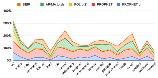 Table 1 show that POLY d(2) had the best 15-day forecasts (MAEr 9 ± 19%), less than half the next competitor, then Prophet d (22 ± 15%) and SEIR (28 ± 16%). ARIMA had (35 ± 16%) and Prophet without differentiation was the worst (55 ± 18%). All techniques had a similar degree of variation between countries (stdevs 15% to 19%). The experiment with multiple alternatives of polynomial regression show that differentiating was useful and the error was smaller with smaller polynomial degree in the tested interval 2 to 4. In essence, the polynomial regression of degree 2 is fitting the curve by a parabola that mimics the initial steep increase of the number of daily cases, then as confinement and social distancing kicks in, the change first to a stabilization and then a decrease of the number of daily cases. But degree 3 or 4 on the differentiated curve also had relatively small errors.